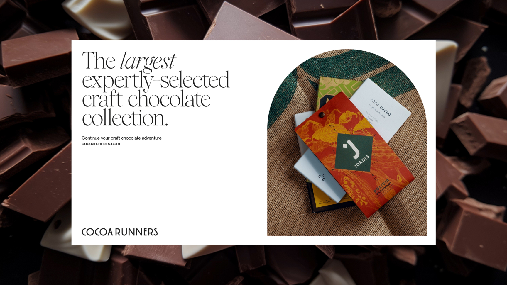 Cocoa Runners had carved out a reputation as the place to go for the finest craft chocolate the planet has to offer, but their repeat customer audience was still confined to the most loyal followers and subscribers. Celebrating their tenth year in business, they challenged us to help consumers access better chocolate, making conscious food choices that are better for people and planet.