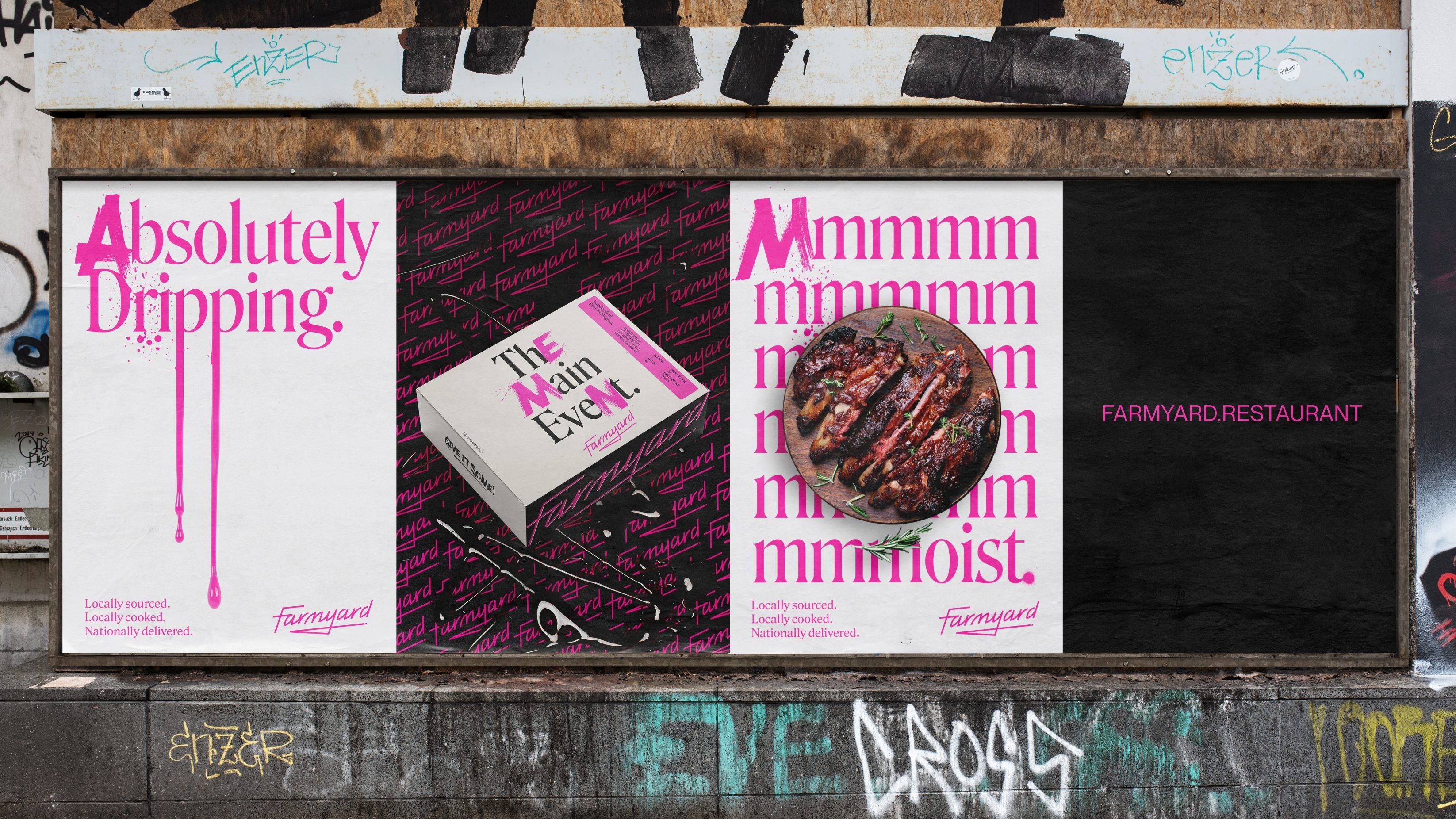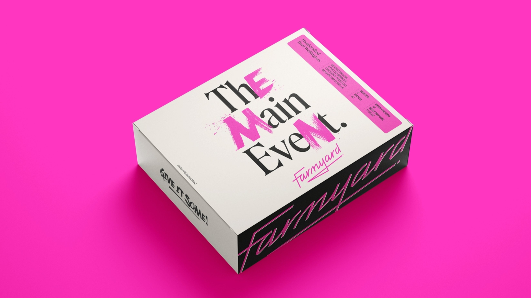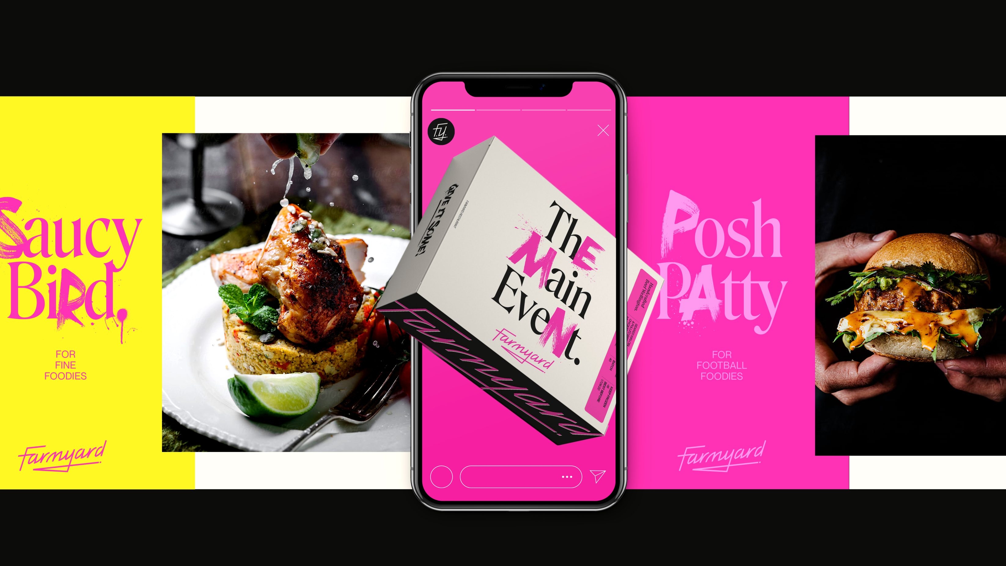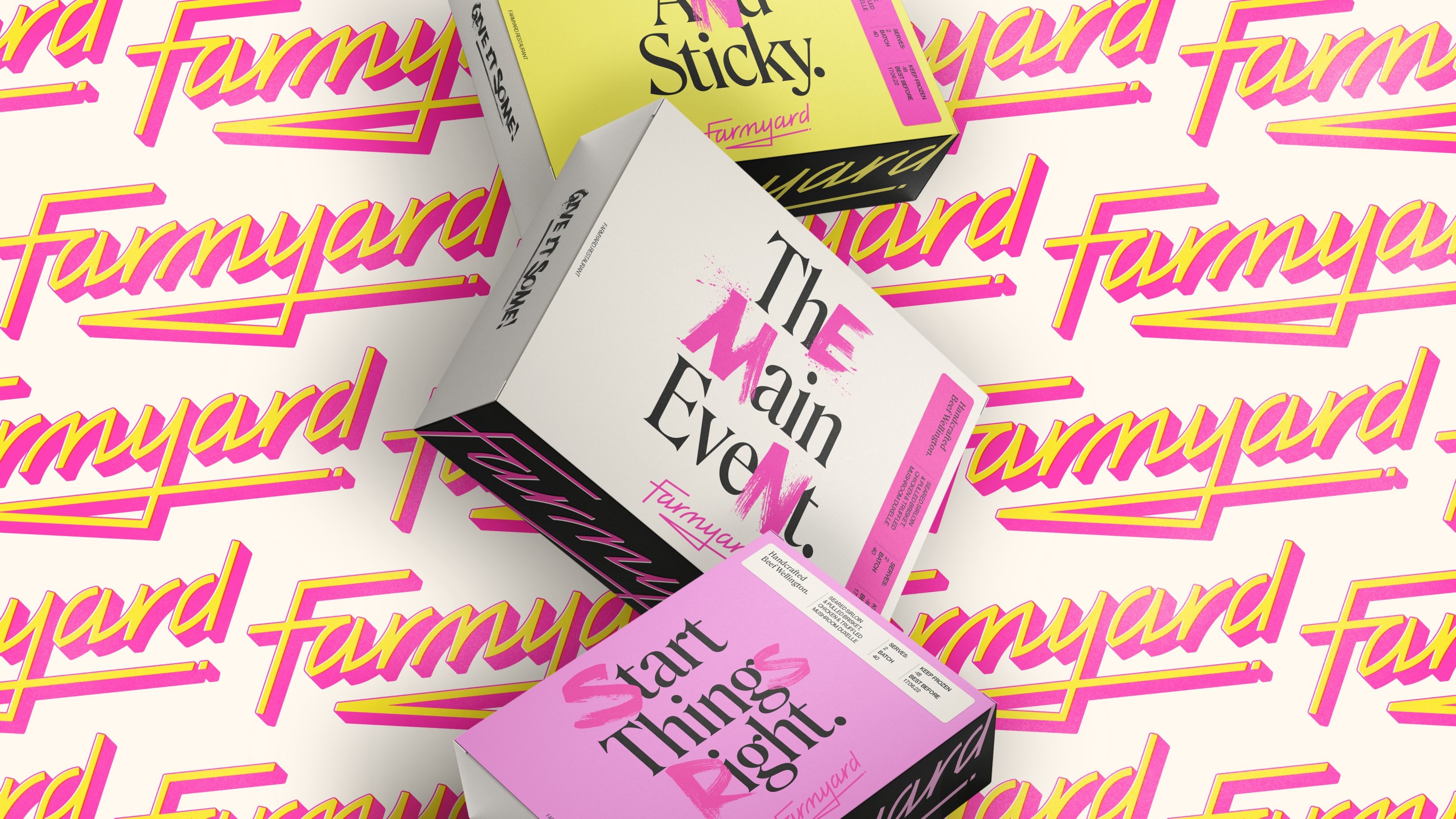 The visual identity intentionally juxtaposed the traditional bucolic imagery conjured by the Farmyard brand name, and instead positioned a prominent pink logo, evoking the bright neon lights of trendy eating spots in vibrant cities and the Farmyard restaurant itself. This edgy brand mark, underscored with a knife sketch, provides a youthful identity to enliven the branding of traditional freezer foods and stuffy connoisseurs, instead it serves up an attitude as direct as the delivery service it offers.