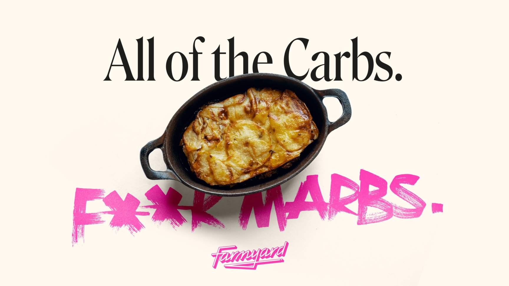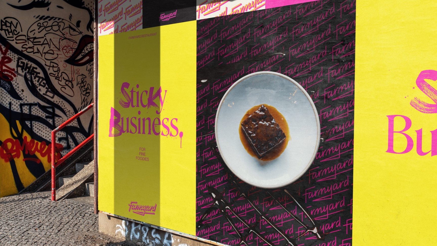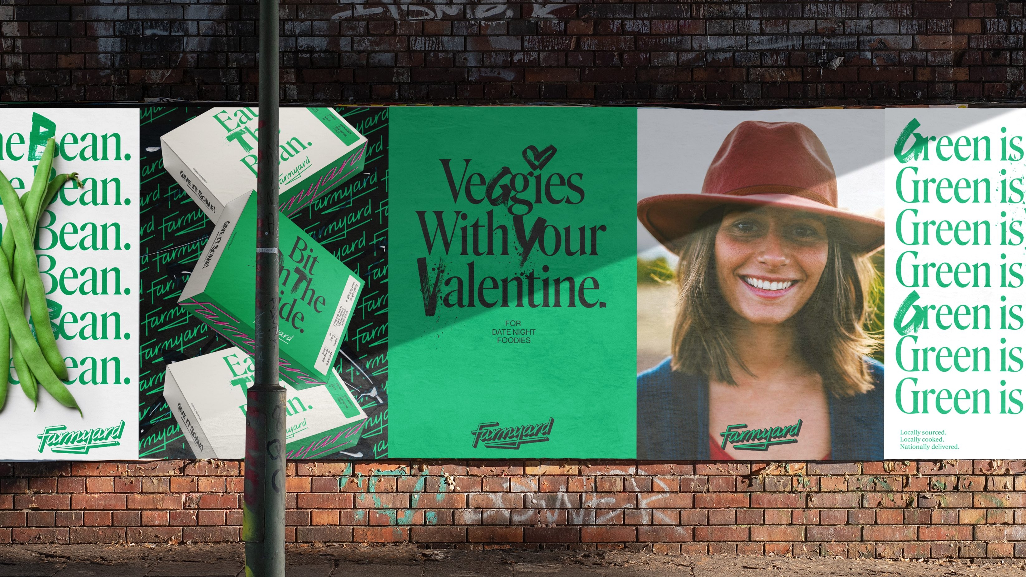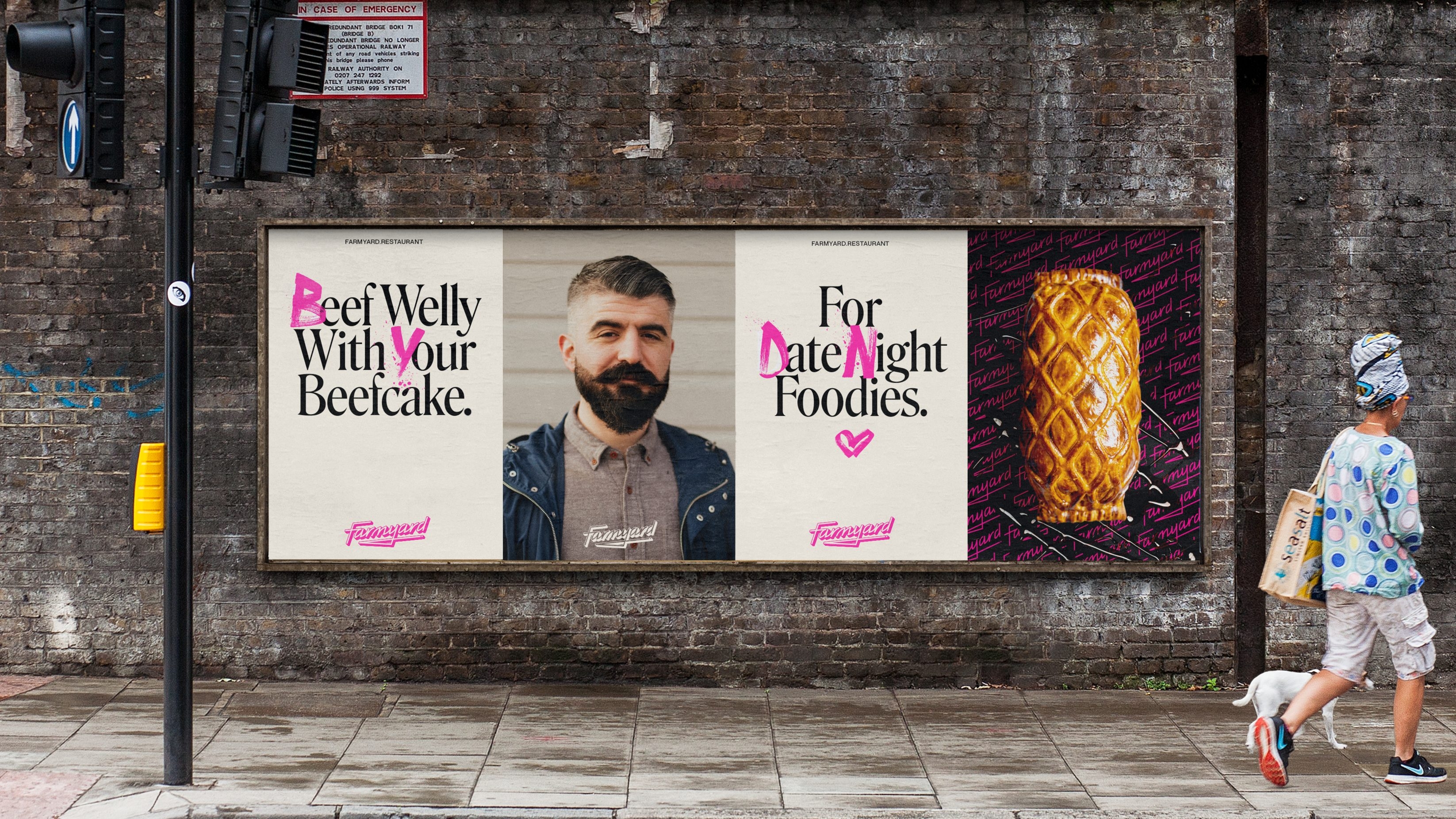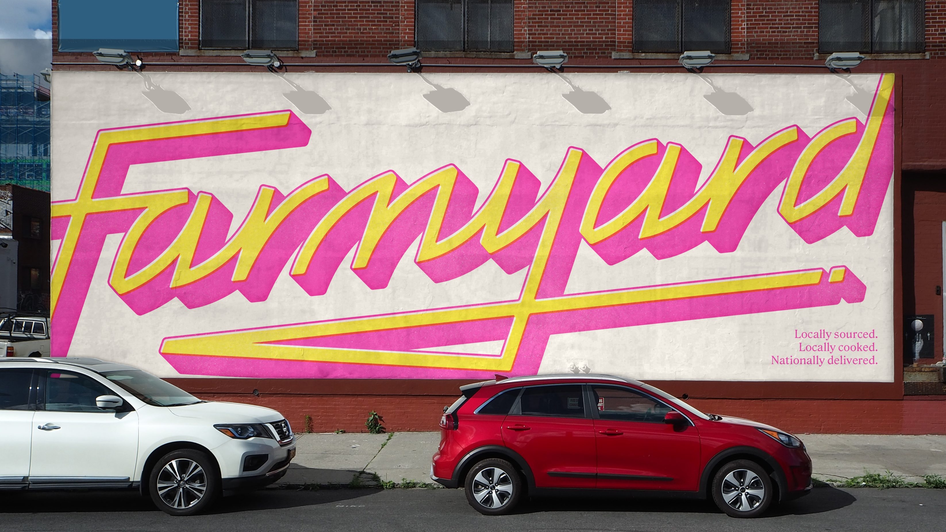 The visual identity intentionally juxtaposed the traditional bucolic imagery conjured by the Farmyard brand name, and instead positioned a prominent pink logo, evoking the bright neon lights of trendy eating spots in vibrant cities and the Farmyard restaurant itself. This edgy brand mark, underscored with a knife sketch, provides a youthful identity to enliven the branding of traditional freezer foods and stuffy connoisseurs, instead it serves up an attitude as direct as the delivery service it offers.