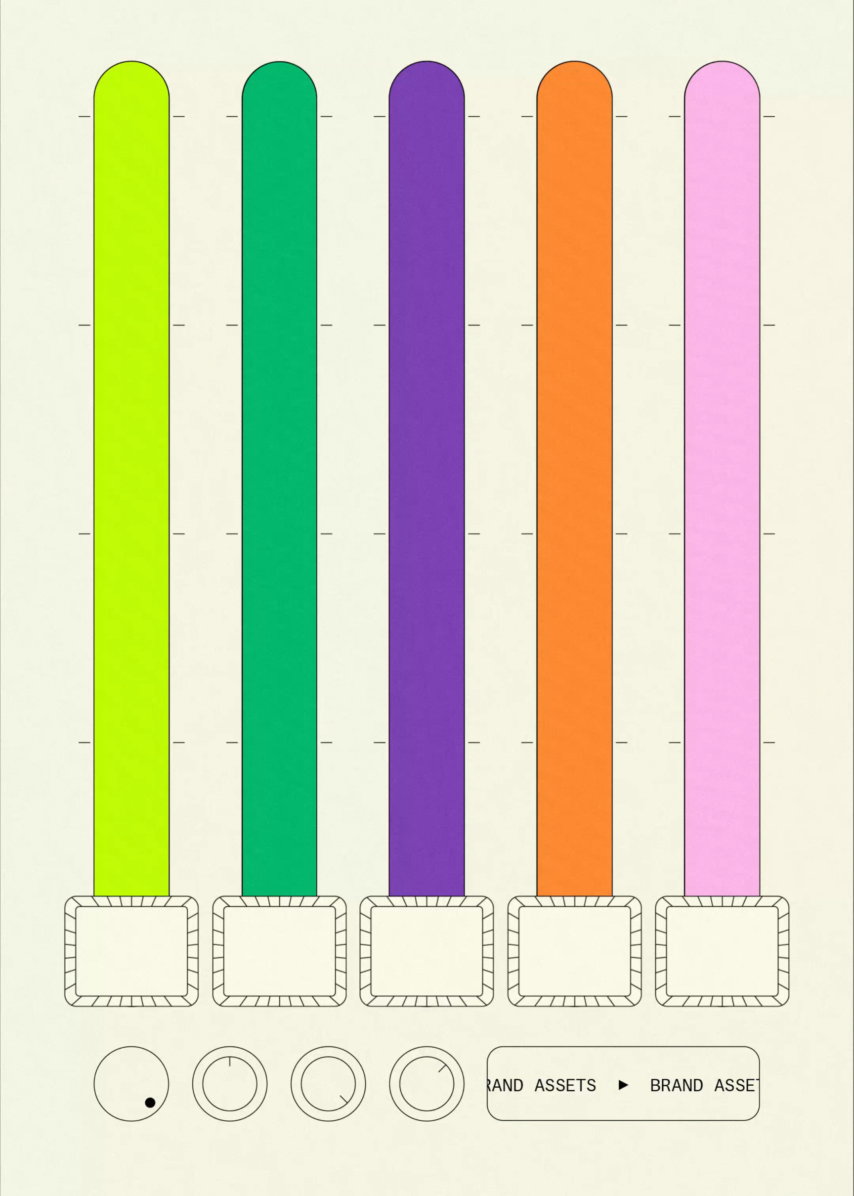 A retro acid yellow, inspired by records and flyers from ‘80s and ‘90s club nights, is one of many big, bold colours that follow the same rhythm as other stylistic choices. Distinct sawtooth patterns beat, wave and move with similar inspirations, rooted in synth waves and equalisers. This sense of movement and amplification also mirrors the new strapline. We designed a modular system that riffed off music equipment and design tropes, creating a flexible system that can be used across promotional material and the website. These dials and digital displays pop up across the brand identity, inspired by the grid-based style of OBI strips, layering an element of analogue onto a digital agency.